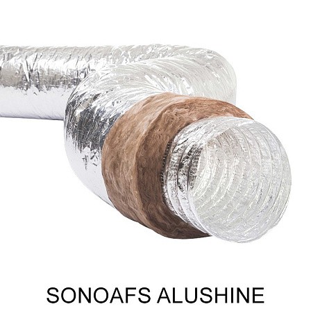 SONOAFS-ALU SHINE ECOSOFT представляют собой гибкие звукопоглощающие воздуховоды теплоизолированные алюминиевые, выполненные из многослойного алюминия и металлизированного полиэстера  (перфорированного), усиленный спиральным каркасом из стальной проволоки с высокой  жесткостью. Внешний чехол выполнен из алюминиевой паронепроницаемой фольги.