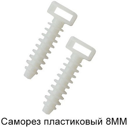 Саморез пластиковый 8MM используется для крепления кабельных хомутов шириной до 9мм при необходимости крепления кабелей на бетонные, деревянные, кирпичные и им подобным несущие поверхности.Диаметр высверливаемого отверстия - 8мм